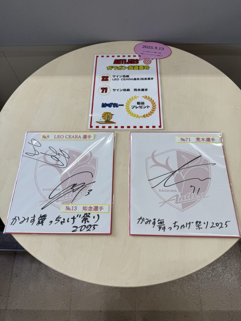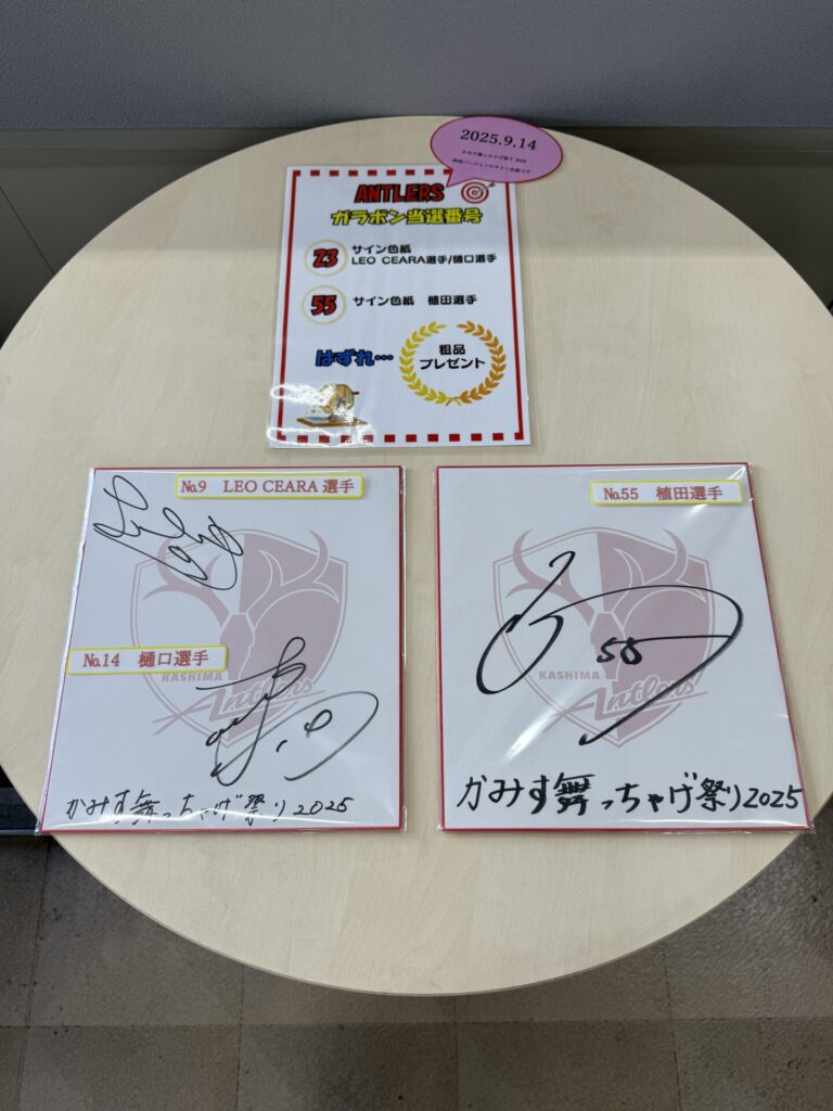 今回は乗車体験した方だけができるガラポンがあり、「VOLVOの景品」「鹿島アントラーズの景品」と2種類ご用意しました。昨年より景品を豪華にし、特に鹿島アントラーズの景品は、選手のサイン色紙というファンには堪らない景品です。しかもお祭りの開催日である9/13と9/14にかけたサイン色紙をいただきました。(写真3枚目、4枚目)(サインを書いていただいた選手の皆さんありがとうございました。ガチファンがアントラーズ愛で当たりを引き当て、大変喜んでいらっしゃいました。)