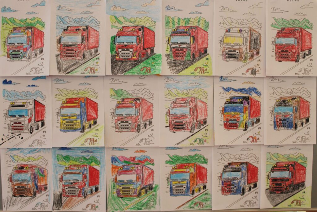 個人情報保護の都合上、楽しんでいる園児の皆さんの姿は載せられませんが、お配りしたトラックのぬりえを素敵に塗ってくれた写真を掲載させていただきます。(みんなー、お勉強した3つの大事な言葉を覚えておいてねー♪)
